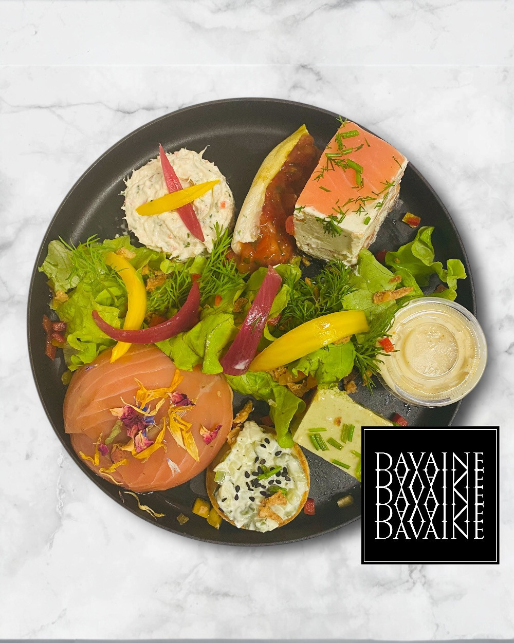 Notre assiette de l'océan est composées de son millefeuille de saumon fumé, Saint Jacques marinées , mini palet scandinave et salade de cabillaud .